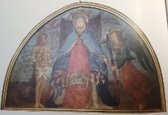 Le iscrizioni sono disposte all’interno di cartigli, eseguite su fondo bianco, la preghiera alla Vergine ha la forma di un dialogo tra i personaggi in scena, e procede verso destra a partire dalla voce del popolo raffigurato ai piedi della Vergine - uomini e bambini a sinistra e donne a destra protetti sotto il manto - e termina in alto con la risposta dell’angelo. Gli oranti chiedono che cessi la moria della peste inviata da Dio, rappresentato in alto in atto di scagliare le sue saette mortifere. Sulla sinistra è raffigurato San Sebastiano trafitto dalle frecce che continua la preghiera di intercessione pronunciando, rivolto verso la Vergine, le parole visualizzate nel cartiglio dall’andamento verticale che si articola in otto righe di scrittura. Maria risponde a sua volta al martire e chiede di riporre la sua spada all’angelo, che sollecito esegue e risponde in latino ‘fiat’