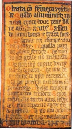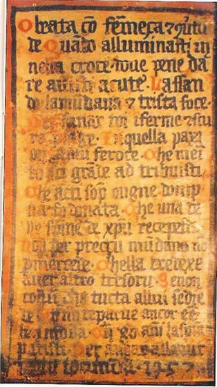Normali per l'area mediana anche il perfetto metafonetico 'avisti' e il perfetto 'fo'; la conservazione sistematica di -u in posizione finale, la conservazione delle vocali aperte in protonia, la conservazione dello /j/ in posizione iniziale e la forma 'alluminasti' con apertura della vocale iniziale, attestata - fra gli altri - nelle Laudes Creaturarum di Francesco d'Assisi (CONTINI 1960, 33-34), e nelle duecentesche Laude della scuola urbinate (BETTARINI 1969, pp. 571 e 603) .