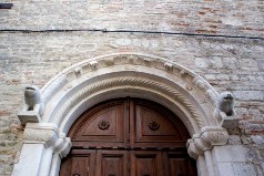 Il portale, in uno stile di passaggio tra il romanico e gotico, è ricco di fregi e simboli in bassorilievo. Il contenuto della prima iscrizione dell’archivolto [3] rimanda a Matteo 23, 12 «Qui se humiliaverit, exaltabitur» e Luca 14, 11 «Qui se humiliat, exaltabitur» mentre l’iscrizione [7] sembra essere la traduzione del Nosce te delle Tusculanae, I, 52 di Cicerone (SABATINI 1996c, pp. 597-599; GAVINI 1927-1928, II, p. 97; ACETO 1986, pp. 532-542). Data l’impossibilità di una ricognizione diretta o su base fotografica, la presente edizione segue la trascrizione interpretativa di SABATINI 1996c, pp. 597-598, salvo al v. 4, 1 (vedi apparato).