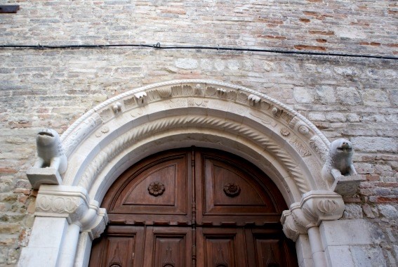La formula della datazione si ripete in 1, 2; Sabatini ritiene che questo possa essere dovuto all’esecuzione in momenti distinti o all’opera di due diversi lapicidi. Anche il diverso modo di rendere /u/ con <U> in 1-4 e <V> nelle ultime due suggerirebbe l’intervento di due mani differenti. Le altre sei iscrizioni si leggono in rettangoli alternati a fregi e su una delle fasce che compongono l’archivolto. Il portale, in uno stile di passaggio tra il romanico e gotico, è ricco di fregi e simboli in bassorilievo.