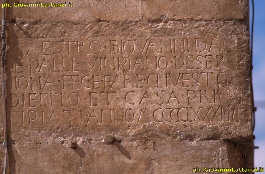 L’iscrizione, realizzata su un concio di pietra rettangolare, risulta abrasa nella parte terminale. Il Palazzo di Giovanni dalle Palle, fatto costruire nel 1484 dall’omonimo mercante veneziano, si trova in posizione d’angolo tra Piazza XX Settembre e Corso Ovidio. MATTIOCCO 2000 ipotizza che a curare la progettazione dell’edificio sia stato un certo Simone architetto veneziano che risulta attivo a Sulmona in quel periodo (p. 43).