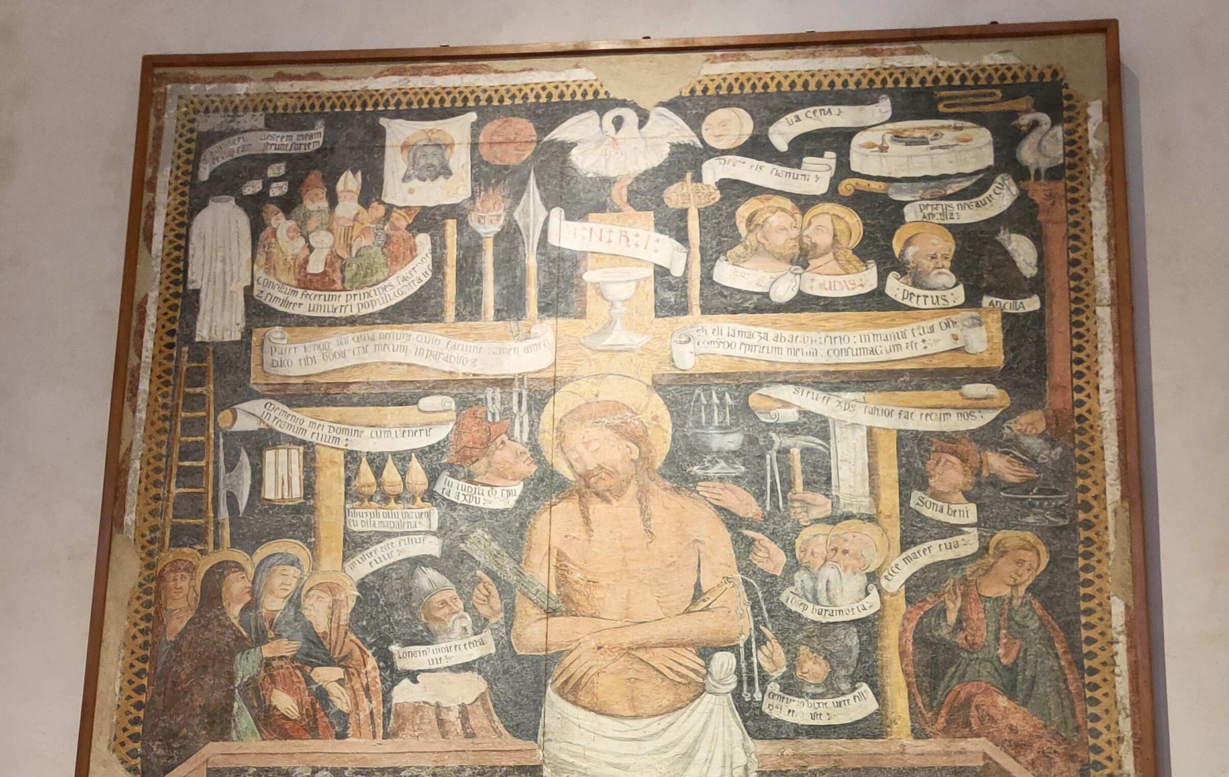 L’opera, interamente inquadrata da un motivo ad archetti intrecciati di color ocra, è suddivisa in due registri. Nel registro superiore, al centro, è posta l'immagine del Cristo crocifisso, in piedi nel sepolcro con accanto gli strumenti della Passione. Ai lati sono evocati eventi e personaggi con numerose immagini, ciascuna glossata da un’iscrizione in minuscola racchiusa entro un cartiglio. Il filo della narrazione è affidato a numerose ma brevi citazioni evangeliche: vestem meam miserunt sortem, concilium fecerunt principes sacerdotes et similiter universi populi contra (Gv 19.24); dedit eis signum (Mt 26, 48); Petrus negavit cum ancilla(Mt 26, 70); Pater dimitte illis quia nesiunt quid faciunt (Lc 23. 34); dico tibi hodie eris mecum in paradiso (Lc 23, 43); Eli eli lamacza abatani(Mt 27,46; Mc 15,34); sitio (Gv 19, 28); in manus tuas com(m)endo spiritum meum: consumactum est (Gv 19, 30); Memento mei domine cum ueneris in regnum tuum (Lc 23, 42); mulier ecce filius(Gv 19,26); Longin(us) vidit et testavit (Gv 19,34); Si tu es chr(ist)s salus fac tecum nos(Lc 23, 39); Ecce mater tua(Gv 19, 27); Centurio dixit vere fili(us)/ Dei erat iste (Mt, 27,54). Accanto alle citazioni evangeliche compaiono battute e chiose in volgare siciliano: La cena, sona beni,li buxuli di l'unguenti di la madalena,lu iudiu che sputa a Christu. Si realizza così una complessa narrazione iconica e verbale, in cui il volgare ha la funzione di illustrare e ravvivare tramite inserti vivaci una storia nota, narrata per mezzo dei Vangeli, con una dinamica assai simile a quella dell'affresco di san Clemente a Roma 12.04, databile a circa quattrocento anni prima. Il registro inferiore è occupato dall'immagine della messa di san Gregorio, ai lati della quale si trovano due cartigli con la notizia delle indulgenze che i pontefici, nel corso del tempo, avevano disposto per coloro che avessero pregato in ginocchio davanti a quell’immagine devozionale. In essi il latino liturgico e formulare trascorre senza soluzione di continuità nel siciliano, e il testo è curiosamente dipinto in un'alternanza di nero e rosso, senza che sia evidente un criterio che guidi questa alternanza; una particolarità che si ritrova in una delle testimonianze più antiche in EDV, la Lapide dei fratelli Lercari 01.01 . L'affresco mostra in entrambi i registri una integrazione fra latino e volgare sorprendente per l'epoca in cui l'opera è stata eseguita, a cui si attribuirebbe oramai una coscienza della distinzaione fra i due sistemi ben più matura. Si noti inoltre che il secondo dei due cartigli contiene un evidente errore: nell'elenco delle sette ragioni per richiedere le indulgenze, manca la seconda.